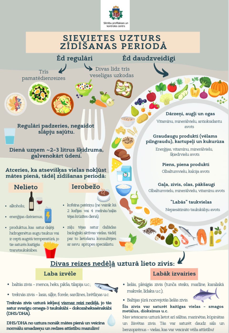 - par sabalansēta uztura pamatprincipiem zīdīšanas laikā – infografika “Sievietes uzturs zīdīšanas periodā”,