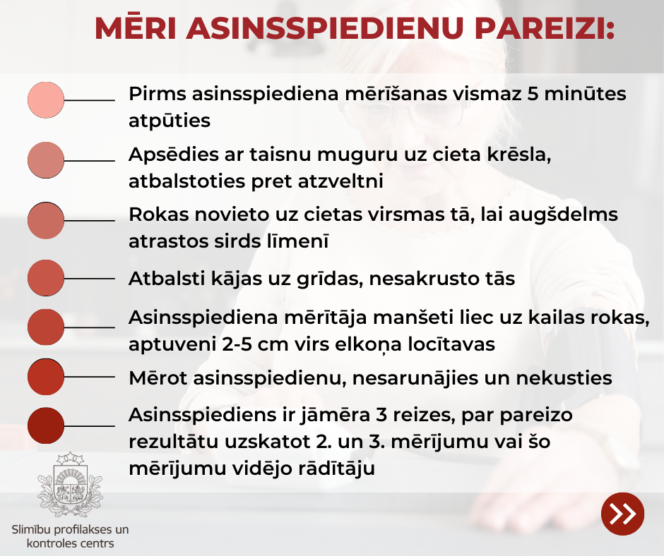 Ikvienam ir jāzina savs asinsspiediens, un jāveic asinsspiediena mērījumi vismaz 1–2 reizes gadā. Asinsspiedienu var viegli un ātri izmērīt mājās, aptiekā vai pie ģimenes ārsta. Asinsspiediena mērīšanas procedūra ir vienkārša, tomēr ir svarīgi to darīt pareizi: