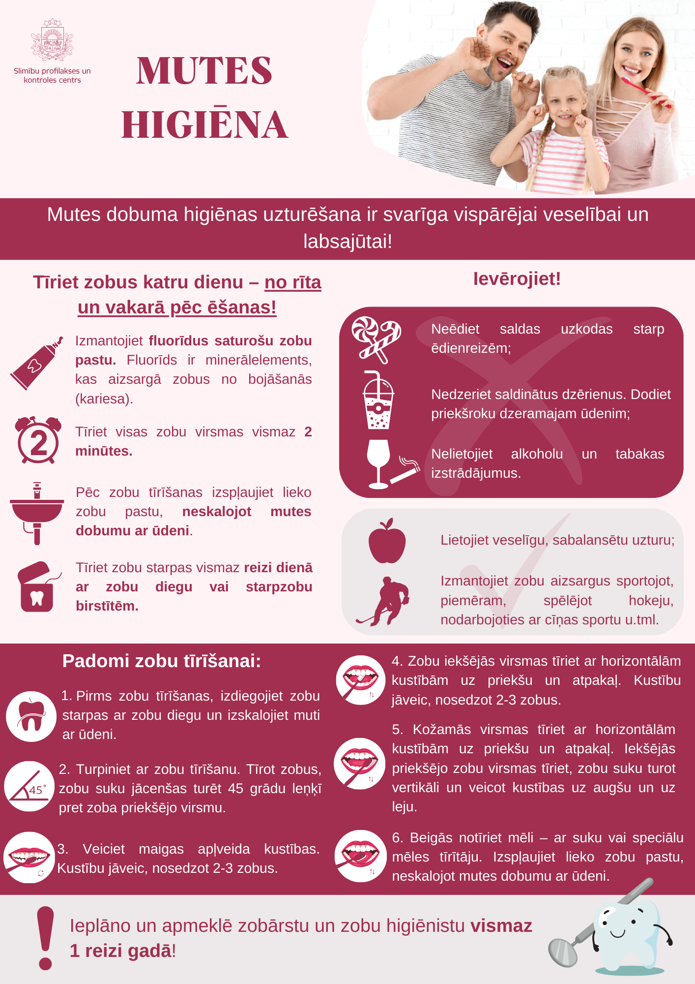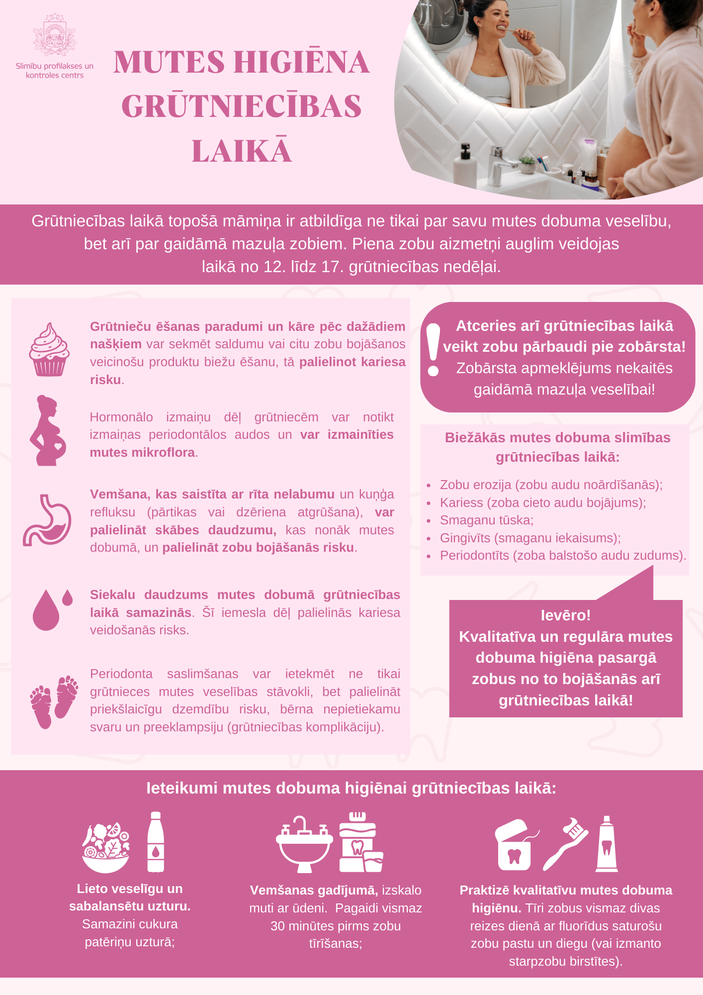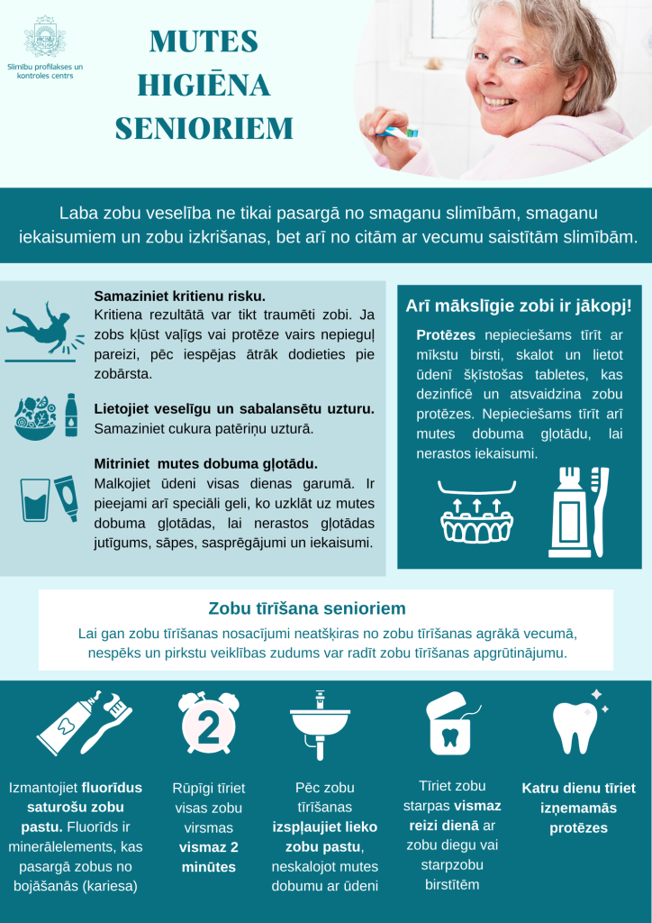 Lai atgādinātu iedzīvotājiem par ieteikumiem, kā parūpēties par mutes dobuma veselību, Slimību profilakses un kontroles centra speciālisti ir izstrādājuši trīs infografikas – mutes higiēna, mutes higiēna grūtniecības laikā un mutes higiēna senioriem.