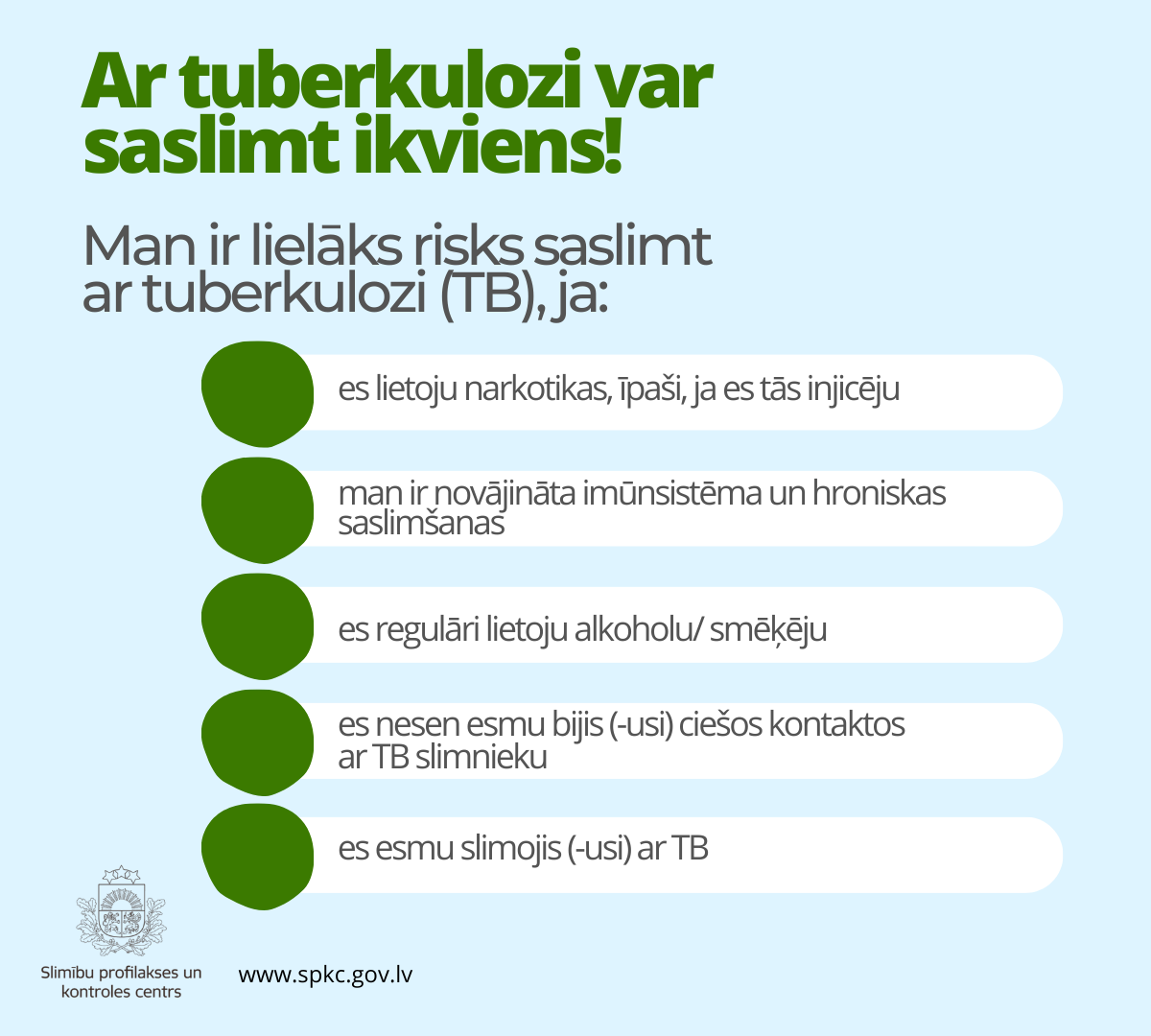 Lai atgādinātu iedzīvotājiem par tuberkulozes profilaksi, simptomiem un ārstēšanas iespējām, Slimību profilakses un kontroles centra speciālisti ir sagatavojuši vairākus informatīvus materiālus.