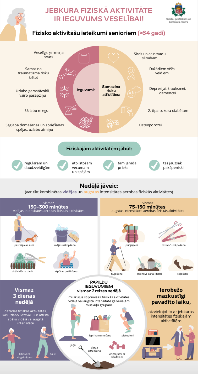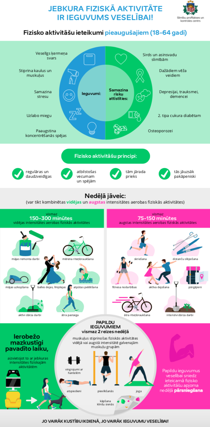Aicinām iepazīties arī ar infografikām par fizisko aktivitāšu ieteikumiem bērniem, pieaugušajiem un senioriem.