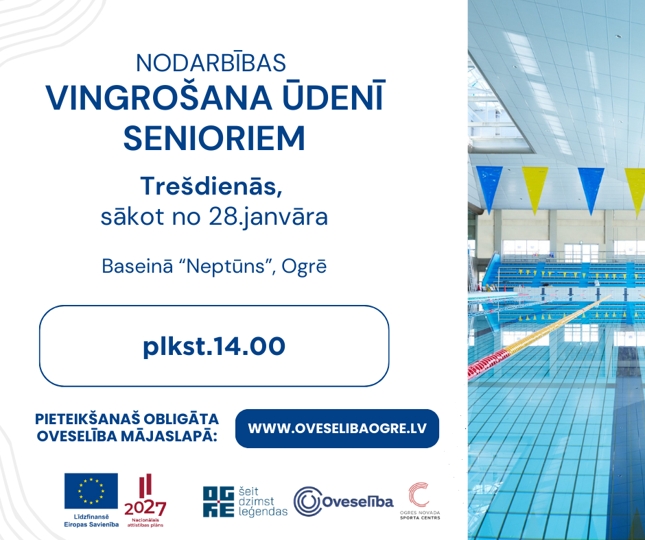4.oktobrī, sestdien, no plkst. 9.00 aicinām piedalīties “Vingro vesels Ogrē!”, kas norisināsies Ogres novada sporta centra ēkā (Skolas ielā 12). Pasākuma programma, kā ierasts, ir veidota ļoti daudzveidīga, piedāvājot dalībniekiem dažādas intensitātes nodarbības, tāpēc tajā ko sev tīkamu atradīs ikviens interesents. 9.00 Veselības vingrošana senioriem | Sanita Baltkalne - sertificēta fizioterapeite Veselības vingrošana zemā līdz vidējā intensitātē – droša un efektīva kustību terapija, kuras galvenais mērķis ir ikdienas pašsajūtas uzlabošana un muskulatūras nostiprināšana. 10.00 Cigun nodarbība | Anita Rezevska - RTU Sporta kompleksa"Ķīpsalas peldbaseins" trenere, Ciguna meistara Igora Kudrjavceva skolas "SAULES CEĻŠ" absolvente !!!!! Cigun grupa ir nokomplektēta, uz šo nodarbību pieteikšanās ir slēgta !!!! Nodarbībā iepazīsiet un praktiski izmēģināsiet Ciguna vingrojumu kompleksu un enerģētisko punktu pašmasāžu, kas palīdzēs vairot možumu, stiprināt ķermeni un veicināt līdzsvarotu labsajūtu ikdien. Ciguns ir vairāk nekā 5000 gadu sena Austrumu atveseļojošās vingrošanas prakse, kas balstās Tradicionālajā Ķīnas medicīnā. Nosaukums CIGUN nozīmē mērķtiecīgu darbu (“Gun”) ar dzīvības enerģiju (“Ci”). 11.00 Deju fitnesa nodarbība "Latino fit" | Elīza Madara Treija - privāto nodarbību trenere Enerģisks treniņš, kas apvieno latīņamerikāņu deju ritmus ar fitnesa elementiem. Deju nodarbībā tiks apgūti latino deju soļi, roku un gurnu kustības vieglā un uzlādējošā horeogrāfijā. 12.00 DEEPWORK | Zigmunds Āboliņš - Starptautiskas BODYART skolas meistarterneris un mācībspēks Latvijā Dinamiska grupu fitnesa nodarbība, kas apvieno spēka, izturības un kustību koordinācijas vingrinājumus ar elpošanas tehnikām. Treniņš notiek basām kājām, stiprinot ne tikai ķermeni, bet arī līdzsvaru un koncentrēšanās spējas. Nodarbības intensitāte mainās no mierīgas iesildīšanās līdz enerģiskai kulminācijai un noslēdzas ar relaksāciju. Tā ir iespēja vienlaikus attīstīt fizisko formu un atjaunot iekšējo enerģijas balansu. 13.00 Hatha-Vinyasa joga | Laura Timoško - privāto nodarbību trenere Nodarbībā tiks kombinētas gan statiskas, gan arī dinamiskas pozas. Statiskās pozas nepieciešamas, lai sazemētos un gūtu stabilitāti, dinamiskās – lai dabūtu plūdumu un harmoniju sevī. Oveselība pasākumu realizē Eiropas Sociālā fonda Plus (ESF+) projekta “Pasākumi veselības veicināšanai un slimību profilaksei Ogres novada iedzīvotājiem” (identifikācijas Nr. 4.1.2.2/1/24/I/022) ietvaros. Dzīvo vesels Ogres novadā! #ESfondi, #EUFunds #EUinmyregion, #InvestEU (Ja Jums piedāvā iespēju aizpildīt pieteikumu, tad pieteikumu nosūtot, Jūsu dalība pasākumā automātiski tiek aptiprināta. Taču, ja pieteikšanās opcija nav aktīva, tas nozīmē, ka dalībnieku grupa ir nokomplektēta un pieteikšanās ir slēgta.) KOMENTĀRU SADAĻĀ OBLIGĀTI NORĀDIET NODARBĪBU(-AS), KURU(-AS) VĒLATIES APMEKLĒT! Svarīgi! Ja Jums ir nepieciešams vingrošanas paklājiņš, lūdzu, aizpildot pieteikumu, norādiet to komentāru sadaļā. Pieteikums