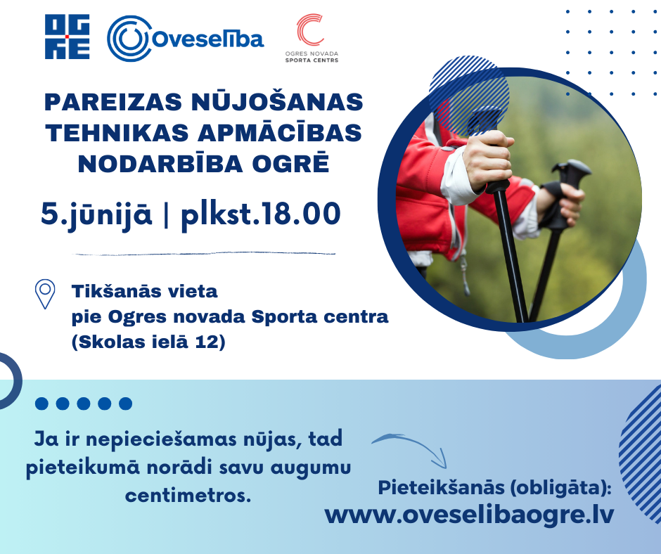 Oveselība aicina apgūt pareizu nūjošanas tehniku Ogrē trešdien, 5.jūnijā, plkst.18.00! Nūjošanas nodarbības laikā būs iespēja ne vien apgūt nūjošanas teorētiskos pamatus, bet tos arī praktiski izmēģināt, saņemot atgriezenisko saiti no trenera. Izmanto iespēju atsvaidzināt vai apgūt pareizas nūjošanas tehnikas prasmes, kā arī sagatavoties š.g.nūjošanas pārgājienu ciklam “Iepazīsti Ogres novadu!”. 📌Tikšanās vieta – Ogres novada Sporta centrs (Skolas ielā 12). 📌Ja Jums nav savu nūjošanas nūju, reģistrējoties norādiet savu augumu cm, lai var sagatavot Jums atbilstošu nūjošanas inventāru. Pasākums ir bezmaksas. Vietu skaits ierobežots, pieteikšanās obligāta. (Ja Jums piedāvā iespēju aizpildīt pieteikumu, tad pieteikumu nosūtot, Jūsu dalība pasākumā automātiski tiek aptiprināta. Taču, ja pieteikšanās opcija nav aktīva, tas nozīmē, ka dalībnieku grupa ir nokomplektēta un pieteikšanās ir slēgta.)