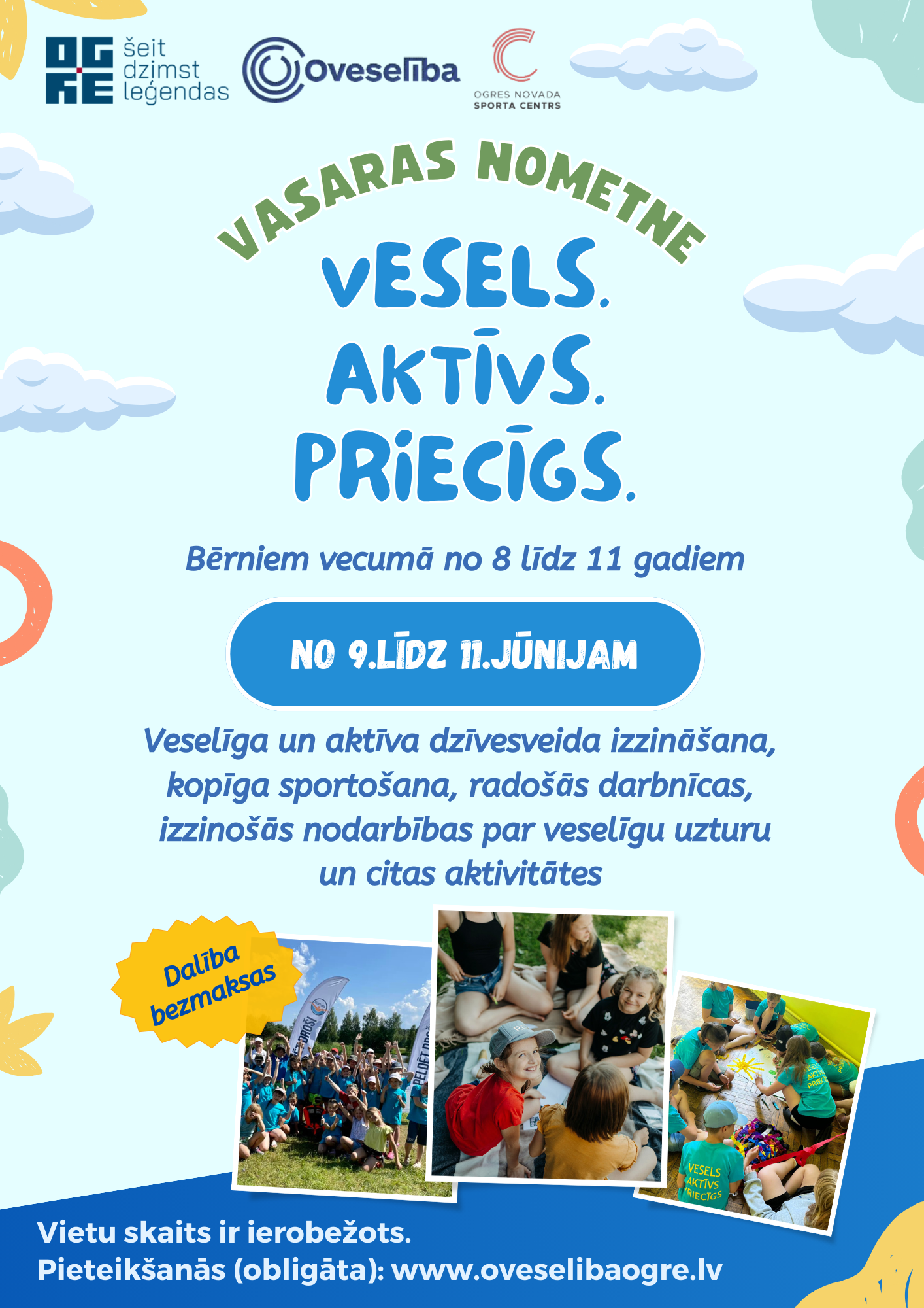 Bērnu un jauniešu nometnē “Vesels. Aktīvs. Priecīgs.” no 9.līdz 11.jūnijam iepazīsim veselīga un aktīva dzīvesveida ieguvumus, kopīgi sportosim, piedalīsimies izzinošās nodarbībās un radošās darbnīcās, kā arī baudīsim skaistās vasaras dienas, dodoties kopīgos piedzīvojumos, izzinot sevi. Izcils sākums vasaras piedzīvojumiem! Vienas nometnes norises laiks – 3 dienas, 2 naktis Jumpravas pamatskolā. Dalība nometnē ir bezmaksas. Nometne paredzēta bērniem vecumā no 8 līdz 11 gadiem. Šovasar tiek organizētas divas vasaras nometnes. Nometņu datumi: 1) 2., 3., 4. jūnijs 2) 9., 10., 11. jūnijs;  📌Pieteikšanās nometnēm ir obligāta, aizpildot pieteikumu Oveselība mājaslapā! 📌Pieteikumā  obligāti norādiet bērna vārdu, uzvārdu, vecumu un vēlamās nometnes datumus. Sīkāku informāciju nosūtīsim e-pastā pēc pieteikuma saņemšanas. KATRU BĒRNU LŪGUMS PIETEIKT ATSEVIŠĶI! AIZPILDOT ATSEVIŠĶU PIETEIKUMU! 👇🏻Aicinām aizpildīt savu pieteikumu nometnei no 9.līdz 11.jūnijam zemāk: (Ja Jums piedāvā iespēju aizpildīt pieteikumu, tad pieteikumu nosūtot, Jūsu dalība pasākumā automātiski tiek aptiprināta. Taču, ja pieteikšanās opcija nav aktīva, tas nozīmē, ka dalībnieku grupa ir nokomplektēta un pieteikšanās ir slēgta.)