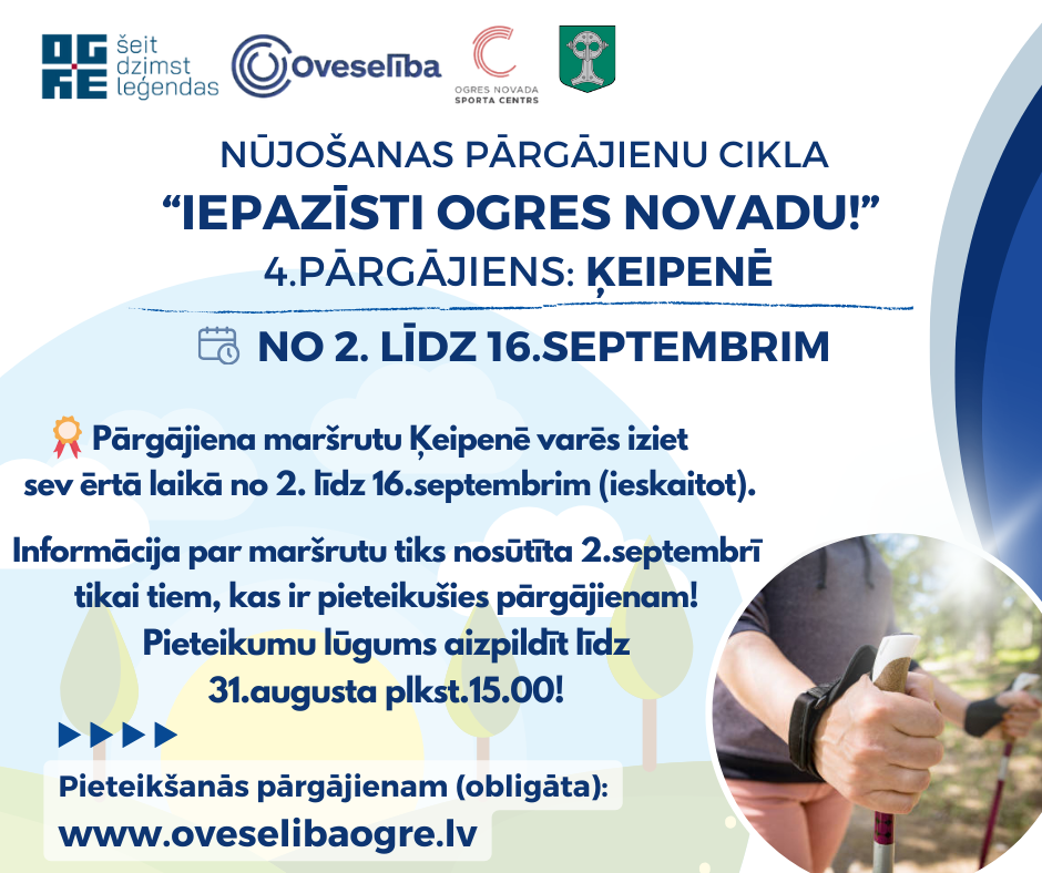 Oveselība aicina uz nūjošanas pārgājienu cikla “Iepazīsti Ogres novadu!” ceturto pārgājienu Ķeipenē! ☀️ Entuziastiskākie dalībnieki, kuri apmeklēs visus nūjošanas pārgājienu cikla “Iepazīsti Ogres novadu!” pārgājienus – iegūs iespēju apmeklēt bezmaksas vingrošanas nodarbības ūdenī trenera vadībā š.g. rudenī! ▶️Pārgājiena maršrutu Ķeipene varēs iziet sev ērtā laikā no 2. līdz 16.septembrim (ieskaitot).  📌Informācija par maršrutu tiks nosūtīta 2.septembrī tikai tiem dalībniekiem, kas būs aizpildījuši pieteikumu pārgājienam Oveselība mājaslapā! Pieteikumu pārgājienam lūgums aizpildīt līdz 31.augusta plkst.15.00!  ❗️Ja Jums nepieciešamas nūjošanas nūjas, lūdzam to norādīt pieteikumā, minot sava auguma garumu cm. AICINĀM AIZPILDĪT SAVU PIETEIKUMU ZEMĀK: (Ja Jums piedāvā iespēju aizpildīt pieteikumu, tad pieteikumu nosūtot, Jūsu dalība pasākumā automātiski tiek aptiprināta. Taču, ja pieteikšanās opcija nav aktīva, tas nozīmē, ka dalībnieku grupa ir nokomplektēta un pieteikšanās ir slēgta.)