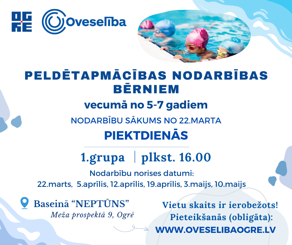 Oveselība aicina bērnus vecumā no 5-7 gadiem uz bezmaksas peldētapmācības nodarbībām Ogres baseinā “Neptūns”! Nodarbībās bērni iepazīs drošas peldēšanas pamatus, gūs ieskatu elpošanas pamatprincipos un peldēšanas prasmēs – uz muguras, uz krūtīm, apgūs kāju un roku kustības ūdenī, kā arī mācīsies izpildīt tādus elementus kā “pludiņš” un “zvaigznīte”. Nodarbības sākot ar 22.martu notiks piektdienās divās grupās: • 1.grupa: piektdienās plkst.16.00 • 2.grupa: piektdienās plkst.16.45 VIETU SKAITS IEROBEŽOTS! Pieteikšanās obligāta. 👇🏻Pieteikšanās uz 1.grupu piektdienās plkst.16.00:  (Ja Jums piedāvā iespēju aizpildīt pieteikumu, tad pieteikumu nosūtot, Jūsu dalība pasākumā automātiski tiek aptiprināta. Taču, ja pieteikšanās opcija nav aktīva, tas nozīmē, ka dalībnieku grupa ir nokomplektēta un pieteikšanās ir slēgta.) Pieteikums