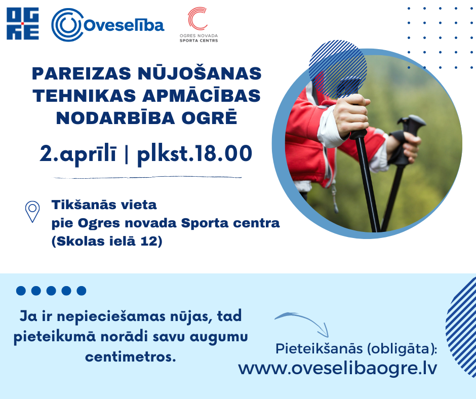 Oveselība aicina apgūt pareizu nūjošanas tehniku Ogrē otrdien, 2.aprīlī, plkst.18.00! Nūjošanas nodarbības laikā būs iespēja ne vien apgūt nūjošanas teorētiskos pamatus, bet tos arī praktiski izmēģināt, saņemot atgriezenisko saiti no trenera. Izmanto iespēju atsvaidzināt vai apgūt pareizas nūjošanas tehnikas prasmes, kā arī sagatavoties š.g.nūjošanas pārgājienu ciklam "Iepazīsti Ogres novadu!" un cikla pirmajam nūjošanas pārgājienam, kas notiks jau 6.aprīlī. 📌Tikšanās vieta - Ogres novada Sporta centrs (Skolas ielā 12). 📌Ja Jums nav savu nūjošanas nūju, reģistrējoties norādiet savu augumu cm, lai var sagatavot Jums atbilstošu nūjošanas inventāru. Pasākums ir bezmaksas. Vietu skaits ierobežots, pieteikšanās obligāta. (Ja Jums piedāvā iespēju aizpildīt pieteikumu, tad pieteikumu nosūtot, Jūsu dalība pasākumā automātiski tiek aptiprināta. Taču, ja pieteikšanās opcija nav aktīva, tas nozīmē, ka dalībnieku grupa ir nokomplektēta un pieteikšanās ir slēgta.)