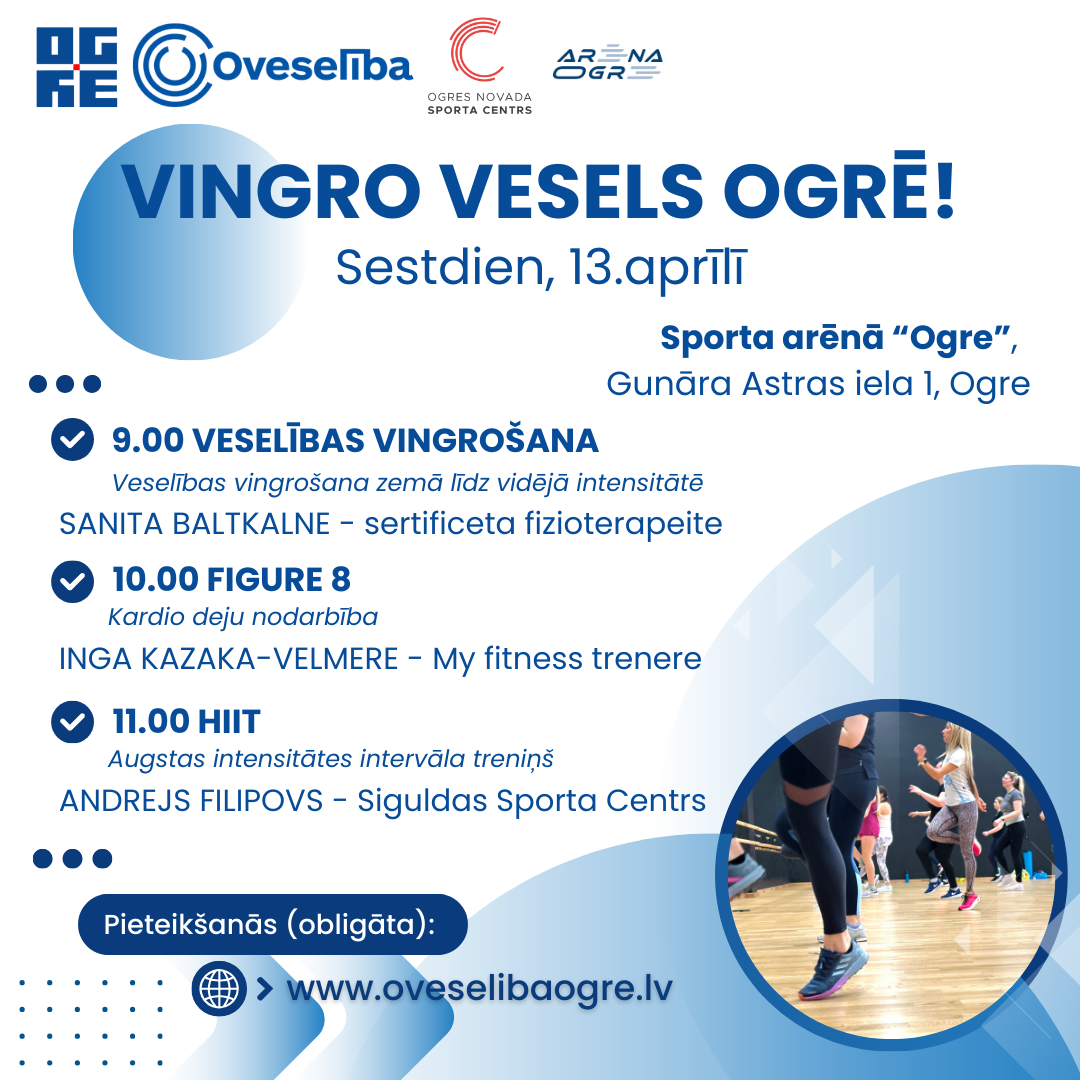 13.aprīlī, sestdien, no plkst. 9.00 aicinām piedalīties “Vingro vesels Ogrē!”, kas norisināsies Sporta arēnā “Ogre”. Pasākuma programma, kā ierasts, ir veidota ļoti daudzveidīga, tāpēc tajā ko sev tīkamu atradīs ikviens interesents. ▶️9.00 VESELĪBAS VINGROŠANA | Santa Baltkalne – sertificeta fizioterapeite Veselības vingrošana zemā līdz vidējā intensitātē – droša un efektīva kustību terapija, kuras galvenais mērķis ir ikdienas pašsajūtas uzlabošana un muskulatūras nostiprināšana. Rīta vingrošanā iesildīsim muskuļus un locītavas, sagatavosim elpošanu un sirdsdarbību tālākai fiziskajai slodzei. ▶️10.00 FIGURE 8 | Inga Kazaka- Velmere – MyFitness trenere Kardio deju nodarbība, kas vērsta uz vēdera preses treniņu. Nodarbībā iekļautas  septiņas dejas: merenga, samba, salsa, pasadoble, jive, rumba un burleskas deja. ▶️11.00 HIIT | Andrejs Filipovs – Siguldas sporta centra treneris. Augstas intensitātes intervāla treniņš, kurā tiek kombinēti augstas un zemas intensitātes vingrinājumi ar atpūtas pauzēm. Pasākums “Vingro vesels Ogrē!” ir bezmaksas, iepriekš piesakoties. 📌Pieteikšanās ir obligāta! VIETU SKAITS IR IEROBEŽOTS. 📌Svarīgi Ja Tev ir nepieciešams vingrošanas paklājiņš, norādi to komentārā piesakoties! PIESAKOTIES, OBLIGĀTI NORĀDIET KOMENTĀRU SADAĻĀ - KURU/-AS NODARBĪBU/-AS JŪS VĒLATIES APMEKLĒT AICINĀM AIZPILDĪT SAVU PIETEIKUMU ZEMĀK: (Ja Jums piedāvā iespēju aizpildīt pieteikumu, tad pieteikumu nosūtot, Jūsu dalība pasākumā automātiski tiek aptiprināta. Taču, ja pieteikšanās opcija nav aktīva, tas nozīmē, ka dalībnieku grupa ir nokomplektēta un pieteikšanās ir slēgta.) Dzīvo vesels Ogres novadā!