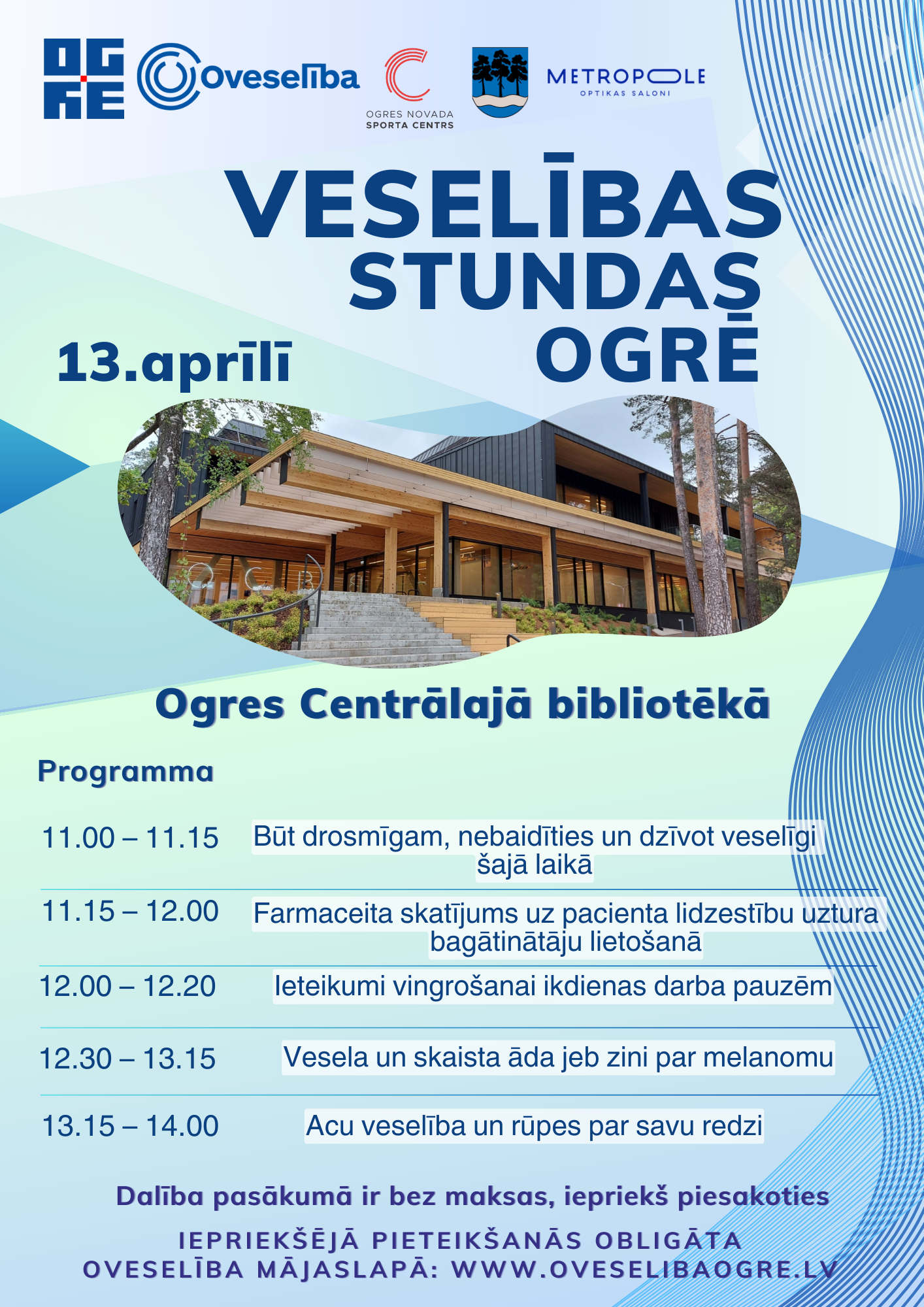 Veselība ir dārgākais kas mums ir un mūsu katra paša ziņā ir par to parūpēties. Aicinām uzturēt vai ieviest jaunus, veselīgus ieradumus savā ikdienā, gūstot idejas Oveselība organizētajā pasākumā VESELĪBAS STUNDAS OGRĒ 13.aprīlī Ogres Centrālajā bibliotēkā! Programma: ▶️11.00 – 11.15 Būt drosmīgam, nebaidīties un dzīvot veselīgi šodien Laiks, kurā dzīvojam, ir mūsu laiks. Šobrīd situācija pasaulē, Latvijā, novadā, savā pilsētā un katra mūsu dzīvē ir pavisam citāda nekā divus, desmit vai divdesmit gadus iepriekš. Jūtamies nedroši, satraukums un spriedze bieži vien ir mūsu ikdienas pavadoņi. Mēs nevaram mainīt to, kas nav maināms, bet mēs varam piedāvāt sev izprast un veidot jaunus ieradumus, kas arī šajā trauksmainajā laikā, var mums sniegt līdzsvaru un prieku dzīvē. Sarunā īsi pieskarsimies teorētiskiem un dažiem praktiskiem padomiem kā palīdzēt sev justies labi, pieņemot pārmaiņas un laika straujo ritējumu. ▶️11.15 – 12.00 Farmaceita skatījums uz pacienta līdzestību uztura bagātinātāju lietošanā Aicinām uz tikšanos ar farmaceitu, lai uzzinātu kam pievērst uzmanību izvēloties uztura bagātinātājus, izprastu atšķirību starp dažādiem terminiem, kas raksturo uztura bagātinātājus, kā arī iegūtu izpratni par savu līdzestību lietojot kā zāles, tā uztura bagātinātājus. Kā veselību ietekmē pareiza, regulāra un atbilstoša preperātu lietošana, balstoties uz ārstu vai farmācijas speciālistu ieteikumiem? Kā uzturs un dzīvesveids ietekmē uztura bagātinātāju izvēli un lietošanu? Kam jāpievērš uzmanība uztura bagātinātāju sastāvā? Kādi ir biežākie mīti un aizspriedumi par uztura batātinātājiem jeb vitamīniem un minerālvielām? ▶️12.00 – 12.20 Ieteikumi vingrošanai ikdienas darba pauzēm Aicinām izmēģināt vingrojumu kompleksu savai labsajūtai ikdienā, smelties idejas un ieviest aktīvas pauzes savā rutīnā, kas veicinās pilnvērtīgu asins cirkulāciju, noslogoto locītavu un sasprindzināto muskuļu atslogojumu. Nav nepieciešams īpašs inventārs. ▶️12.30 – 13.15 Vesela un skaita āda jeb zini par melanomu Ādas veselība ir svarīga ikvienā vecumā. Aicinām uzzināt vairāk par ādas veselību un melanomu, tās rašanās cēloņiem un profilakses pasākumiem, ko varam veikt ik dienas, lai pasargātu savu ādu. Melanoma ir viena no agresīvākajām vēža formām. Risks saslimt ar ādas vēzi dažādu faktoru dēļ arvien palielinās, tādēļ ir būtiski apzināt un novērst iespējamos riska faktorus, kas var provocēt slimības attīstību. ▶️13.15 – 14.00 Acu veselību un rūpes par savu redzi Laba redze ir būtiska kvalitatīvas dzīves sastāvdaļa, tādēļ par acu veselību ir jārūpējas ikvienā vecumā. Acu veselību tiešā veidā ietekmē darbs pie datora un citu ekrānu intensīva lietošana, kas veicina acu nogurumu, rada sausumu, saspringumu, miglošanos un kas var pasliktināt redzi. Katrā vecumā ir dažādi acu saslimšanas riski, un ikvienam cilvēkam ar gadiem šie riski tikai palielinās, tāpēc rūpes par acu veselību ikdienā jāuzņemas katram cilvēkam individuāli. 👇🏻Aicinām aizpildīt savu pieteikumu Veselības stundām Ogrē zemāk:  (Ja Jums piedāvā iespēju aizpildīt pieteikumu, tad pieteikumu nosūtot, Jūsu dalība pasākumā automātiski tiek aptiprināta. Taču, ja pieteikšanās opcija nav aktīva, tas nozīmē, ka dalībnieku grupa ir nokomplektēta un pieteikšanās ir slēgta.)
