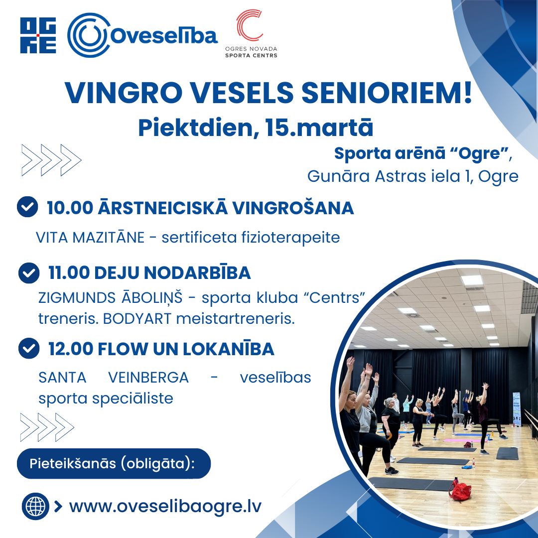 15.martā no plkst. 10.00 aicinām piedalīties “Vingro vesels senioriem!”, kas norisināsies Sporta arēnā “Ogre”. Pasākuma programma veidota daudzveidīga un ir īpaši pielāgota gados vecāko cilvēku vajadzībām – tāpēc tajā ko sev tīkamu atradīs ikviens interesents. 10.00 | ĀRSTNEICISKĀ VINGROŠANA | Vita Mazitāne – sertificēta fizioterapeite. Ārstneiciskā vingrošana sertificeta fizioterapeita vadība. Tā būs kustību terapija, kuras laikā tiks apzināts savs ķermenis, kontrolēta pozu noturēšana dažādās plaknēs un vingrinājumu veikšana visam ķermenim nekaitējot veselībai. 11.00 | DEJU NODARBĪBA | Zigmunds Āboliņš – sporta kluba “Centrs” treneris, Starptautiskās BODYART skolas meistartreneris un mācībspēks Latvijā. Deju nodarbība – tā ir nodarbība, kurā dejas un kustību prieks uzlabo gan fizisko, gan emocionālo veselību. No vienkāršiem deju soļiem populāras un ritmiskas mūzikas pavadījumā veidosim kombināciju labam garastāvoklim. 12.00 | FLOW UN LOKANĪBA | Santa Veinberga – veselības sporta speciāliste. Plūstoša nodarbība mierīgas mūzikas pavadībā, kuras laikā tiek veikti dažādi lokanības un elpošanas vingrinājumi, lai nomierinātu ķermeni un prātu 📌 Pasākums “Vingro vesels senioriem!” ir bezmaksas. Pieteikšanās pasākumam ir obligāta! ‼️Svarīgi‼️ 👉🏻Ja Tev ir nepieciešams vingrošanas paklājiņš, norādi to komentārā piesakoties! AICINĀM AIZPILDĪT SAVU PIETEIKUMU ZEMĀK: (Ja Jums piedāvā iespēju aizpildīt pieteikumu, tad pieteikumu nosūtot, Jūsu dalība pasākumā automātiski tiek aptiprināta. Taču, ja pieteikšanās opcija nav aktīva, tas nozīmē, ka dalībnieku grupa ir nokomplektēta un pieteikšanās ir slēgta.)