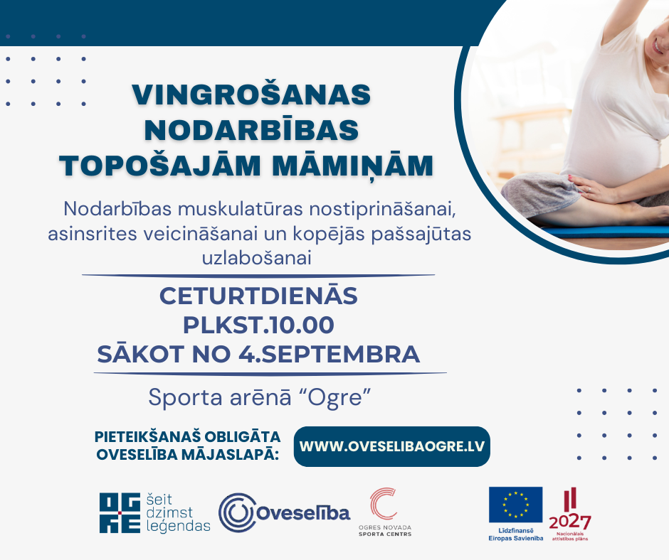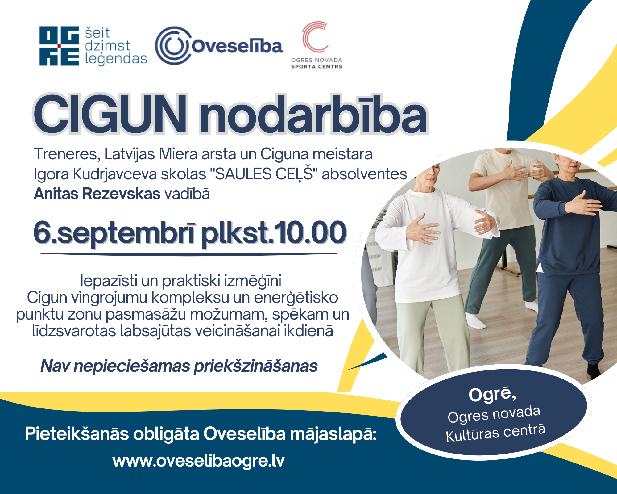 4.oktobrī, sestdien, no plkst. 9.00 aicinām piedalīties “Vingro vesels Ogrē!”, kas norisināsies Ogres novada sporta centra ēkā (Skolas ielā 12). Pasākuma programma, kā ierasts, ir veidota ļoti daudzveidīga, piedāvājot dalībniekiem dažādas intensitātes nodarbības, tāpēc tajā ko sev tīkamu atradīs ikviens interesents. 9.00 Veselības vingrošana senioriem | Sanita Baltkalne - sertificēta fizioterapeite Veselības vingrošana zemā līdz vidējā intensitātē – droša un efektīva kustību terapija, kuras galvenais mērķis ir ikdienas pašsajūtas uzlabošana un muskulatūras nostiprināšana. 10.00 Cigun nodarbība | Anita Rezevska - RTU Sporta kompleksa"Ķīpsalas peldbaseins" trenere, Ciguna meistara Igora Kudrjavceva skolas "SAULES CEĻŠ" absolvente !!!!! Cigun grupa ir nokomplektēta, uz šo nodarbību pieteikšanās ir slēgta !!!! Nodarbībā iepazīsiet un praktiski izmēģināsiet Ciguna vingrojumu kompleksu un enerģētisko punktu pašmasāžu, kas palīdzēs vairot možumu, stiprināt ķermeni un veicināt līdzsvarotu labsajūtu ikdien. Ciguns ir vairāk nekā 5000 gadu sena Austrumu atveseļojošās vingrošanas prakse, kas balstās Tradicionālajā Ķīnas medicīnā. Nosaukums CIGUN nozīmē mērķtiecīgu darbu (“Gun”) ar dzīvības enerģiju (“Ci”). 11.00 Deju fitnesa nodarbība "Latino fit" | Elīza Madara Treija - privāto nodarbību trenere Enerģisks treniņš, kas apvieno latīņamerikāņu deju ritmus ar fitnesa elementiem. Deju nodarbībā tiks apgūti latino deju soļi, roku un gurnu kustības vieglā un uzlādējošā horeogrāfijā. 12.00 DEEPWORK | Zigmunds Āboliņš - Starptautiskas BODYART skolas meistarterneris un mācībspēks Latvijā Dinamiska grupu fitnesa nodarbība, kas apvieno spēka, izturības un kustību koordinācijas vingrinājumus ar elpošanas tehnikām. Treniņš notiek basām kājām, stiprinot ne tikai ķermeni, bet arī līdzsvaru un koncentrēšanās spējas. Nodarbības intensitāte mainās no mierīgas iesildīšanās līdz enerģiskai kulminācijai un noslēdzas ar relaksāciju. Tā ir iespēja vienlaikus attīstīt fizisko formu un atjaunot iekšējo enerģijas balansu. 13.00 Hatha-Vinyasa joga | Laura Timoško - privāto nodarbību trenere Nodarbībā tiks kombinētas gan statiskas, gan arī dinamiskas pozas. Statiskās pozas nepieciešamas, lai sazemētos un gūtu stabilitāti, dinamiskās – lai dabūtu plūdumu un harmoniju sevī. Oveselība pasākumu realizē Eiropas Sociālā fonda Plus (ESF+) projekta “Pasākumi veselības veicināšanai un slimību profilaksei Ogres novada iedzīvotājiem” (identifikācijas Nr. 4.1.2.2/1/24/I/022) ietvaros. Dzīvo vesels Ogres novadā! #ESfondi, #EUFunds #EUinmyregion, #InvestEU (Ja Jums piedāvā iespēju aizpildīt pieteikumu, tad pieteikumu nosūtot, Jūsu dalība pasākumā automātiski tiek aptiprināta. Taču, ja pieteikšanās opcija nav aktīva, tas nozīmē, ka dalībnieku grupa ir nokomplektēta un pieteikšanās ir slēgta.) KOMENTĀRU SADAĻĀ OBLIGĀTI NORĀDIET NODARBĪBU(-AS), KURU(-AS) VĒLATIES APMEKLĒT! Svarīgi! Ja Jums ir nepieciešams vingrošanas paklājiņš, lūdzu, aizpildot pieteikumu, norādiet to komentāru sadaļā. Pieteikums