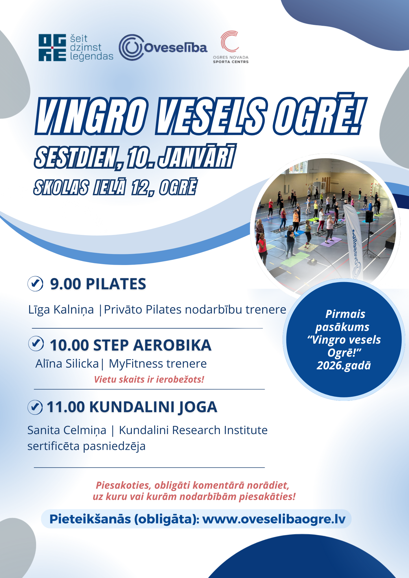 4.oktobrī, sestdien, no plkst. 9.00 aicinām piedalīties “Vingro vesels Ogrē!”, kas norisināsies Ogres novada sporta centra ēkā (Skolas ielā 12). Pasākuma programma, kā ierasts, ir veidota ļoti daudzveidīga, piedāvājot dalībniekiem dažādas intensitātes nodarbības, tāpēc tajā ko sev tīkamu atradīs ikviens interesents. 9.00 Veselības vingrošana senioriem | Sanita Baltkalne - sertificēta fizioterapeite Veselības vingrošana zemā līdz vidējā intensitātē – droša un efektīva kustību terapija, kuras galvenais mērķis ir ikdienas pašsajūtas uzlabošana un muskulatūras nostiprināšana. 10.00 Cigun nodarbība | Anita Rezevska - RTU Sporta kompleksa"Ķīpsalas peldbaseins" trenere, Ciguna meistara Igora Kudrjavceva skolas "SAULES CEĻŠ" absolvente !!!!! Cigun grupa ir nokomplektēta, uz šo nodarbību pieteikšanās ir slēgta !!!! Nodarbībā iepazīsiet un praktiski izmēģināsiet Ciguna vingrojumu kompleksu un enerģētisko punktu pašmasāžu, kas palīdzēs vairot možumu, stiprināt ķermeni un veicināt līdzsvarotu labsajūtu ikdien. Ciguns ir vairāk nekā 5000 gadu sena Austrumu atveseļojošās vingrošanas prakse, kas balstās Tradicionālajā Ķīnas medicīnā. Nosaukums CIGUN nozīmē mērķtiecīgu darbu (“Gun”) ar dzīvības enerģiju (“Ci”). 11.00 Deju fitnesa nodarbība "Latino fit" | Elīza Madara Treija - privāto nodarbību trenere Enerģisks treniņš, kas apvieno latīņamerikāņu deju ritmus ar fitnesa elementiem. Deju nodarbībā tiks apgūti latino deju soļi, roku un gurnu kustības vieglā un uzlādējošā horeogrāfijā. 12.00 DEEPWORK | Zigmunds Āboliņš - Starptautiskas BODYART skolas meistarterneris un mācībspēks Latvijā Dinamiska grupu fitnesa nodarbība, kas apvieno spēka, izturības un kustību koordinācijas vingrinājumus ar elpošanas tehnikām. Treniņš notiek basām kājām, stiprinot ne tikai ķermeni, bet arī līdzsvaru un koncentrēšanās spējas. Nodarbības intensitāte mainās no mierīgas iesildīšanās līdz enerģiskai kulminācijai un noslēdzas ar relaksāciju. Tā ir iespēja vienlaikus attīstīt fizisko formu un atjaunot iekšējo enerģijas balansu. 13.00 Hatha-Vinyasa joga | Laura Timoško - privāto nodarbību trenere Nodarbībā tiks kombinētas gan statiskas, gan arī dinamiskas pozas. Statiskās pozas nepieciešamas, lai sazemētos un gūtu stabilitāti, dinamiskās – lai dabūtu plūdumu un harmoniju sevī. Oveselība pasākumu realizē Eiropas Sociālā fonda Plus (ESF+) projekta “Pasākumi veselības veicināšanai un slimību profilaksei Ogres novada iedzīvotājiem” (identifikācijas Nr. 4.1.2.2/1/24/I/022) ietvaros. Dzīvo vesels Ogres novadā! #ESfondi, #EUFunds #EUinmyregion, #InvestEU (Ja Jums piedāvā iespēju aizpildīt pieteikumu, tad pieteikumu nosūtot, Jūsu dalība pasākumā automātiski tiek aptiprināta. Taču, ja pieteikšanās opcija nav aktīva, tas nozīmē, ka dalībnieku grupa ir nokomplektēta un pieteikšanās ir slēgta.) KOMENTĀRU SADAĻĀ OBLIGĀTI NORĀDIET NODARBĪBU(-AS), KURU(-AS) VĒLATIES APMEKLĒT! Svarīgi! Ja Jums ir nepieciešams vingrošanas paklājiņš, lūdzu, aizpildot pieteikumu, norādiet to komentāru sadaļā. Pieteikums