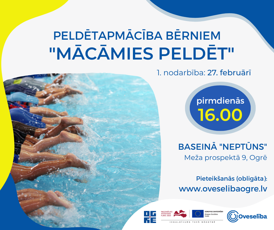 Oveselība aicina 6 – 8 gadus vecus bērnus uz bezmaksas peldētapmācības nodarbībām Ogres baseinā “Neptūns”!