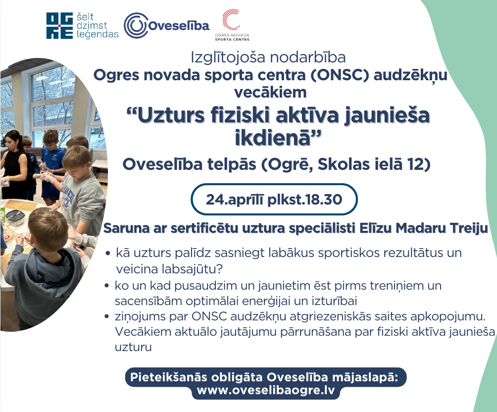 Oveselība aicina Ogres novada Sporta centra (ONSC) audzēkņu vecākus uz izglītojošu nodarbību “Uzturs fiziski aktīva jaunieša ikdienā”!