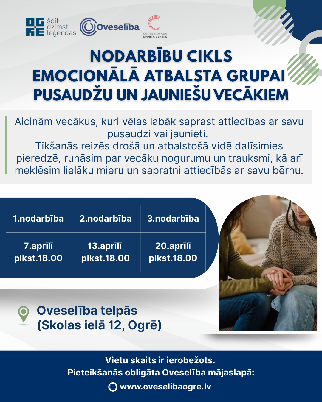 Oveselība aicina pusaudžu un jauniešu vecākus piedalīties divu nodarbību emocionālā atbalsta grupu ciklā. Attiecības ar pusaudzi nereti kļūst sarežģītas – pieaug spriedze, rodas attālināšanās un sajūta, ka viens otru vairs nesaprotam. Tajā pašā laikā vecāku atbalsts jaunietim ir ļoti būtisks arī tad, ja viņš to pats neizrāda.