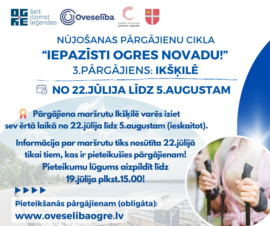 Entuziastiskākie dalībnieki, kuri apmeklēs visus nūjošanas pārgājienu cikla “Iepazīsti Ogres novadu!” pārgājienus – iegūs iespēju apmeklēt bezmaksas vingrošanas nodarbības ūdenī trenera vadībā š.g. rudenī!