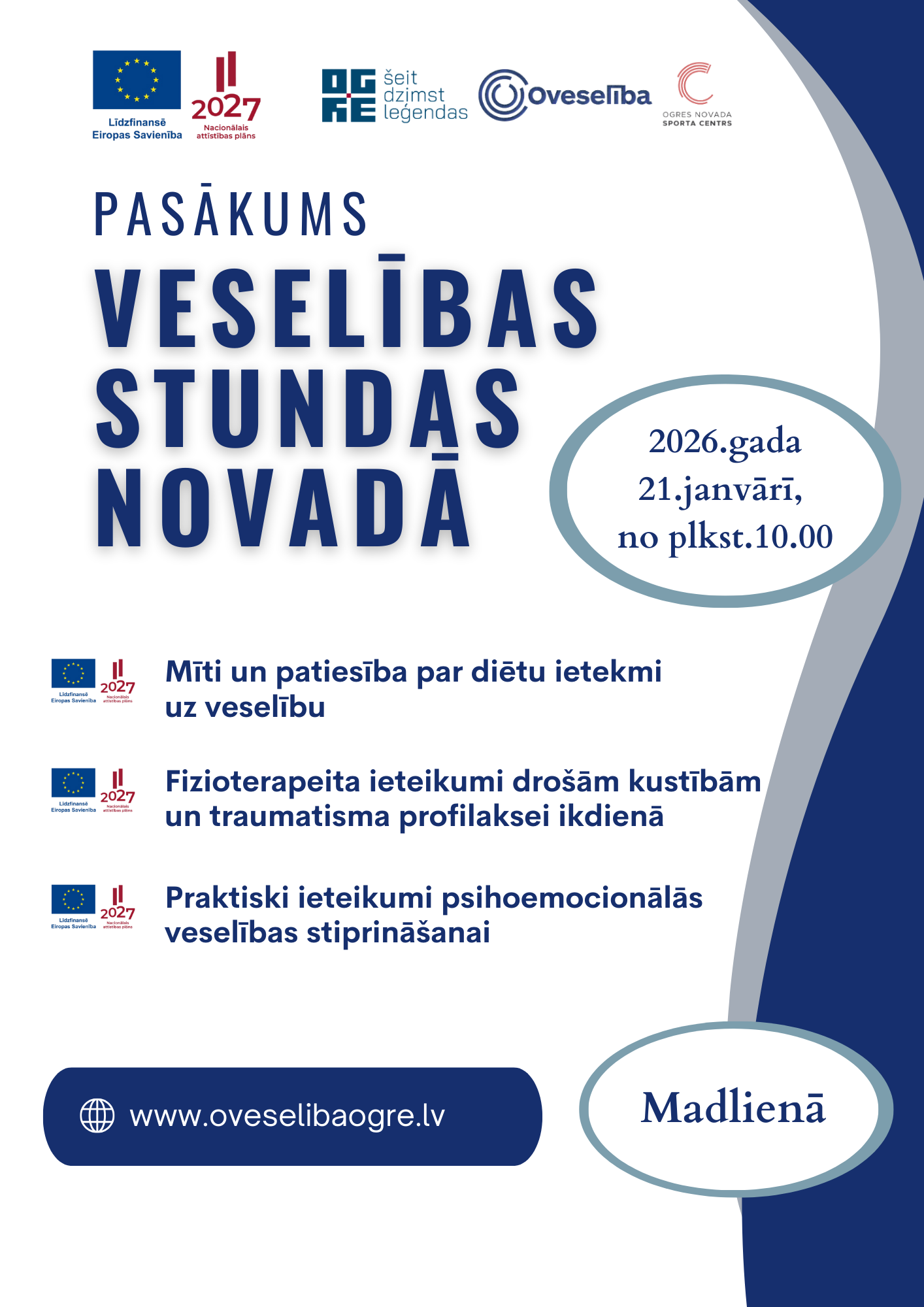 Oveselība pasākumu realizē Eiropas Sociālā fonda Plus (ESF+) projekta “Pasākumi veselības veicināšanai un slimību profilaksei Ogres novada iedzīvotājiem” (identifikācijas Nr. 4.1.2.2/1/24/I/022) ietvaros.