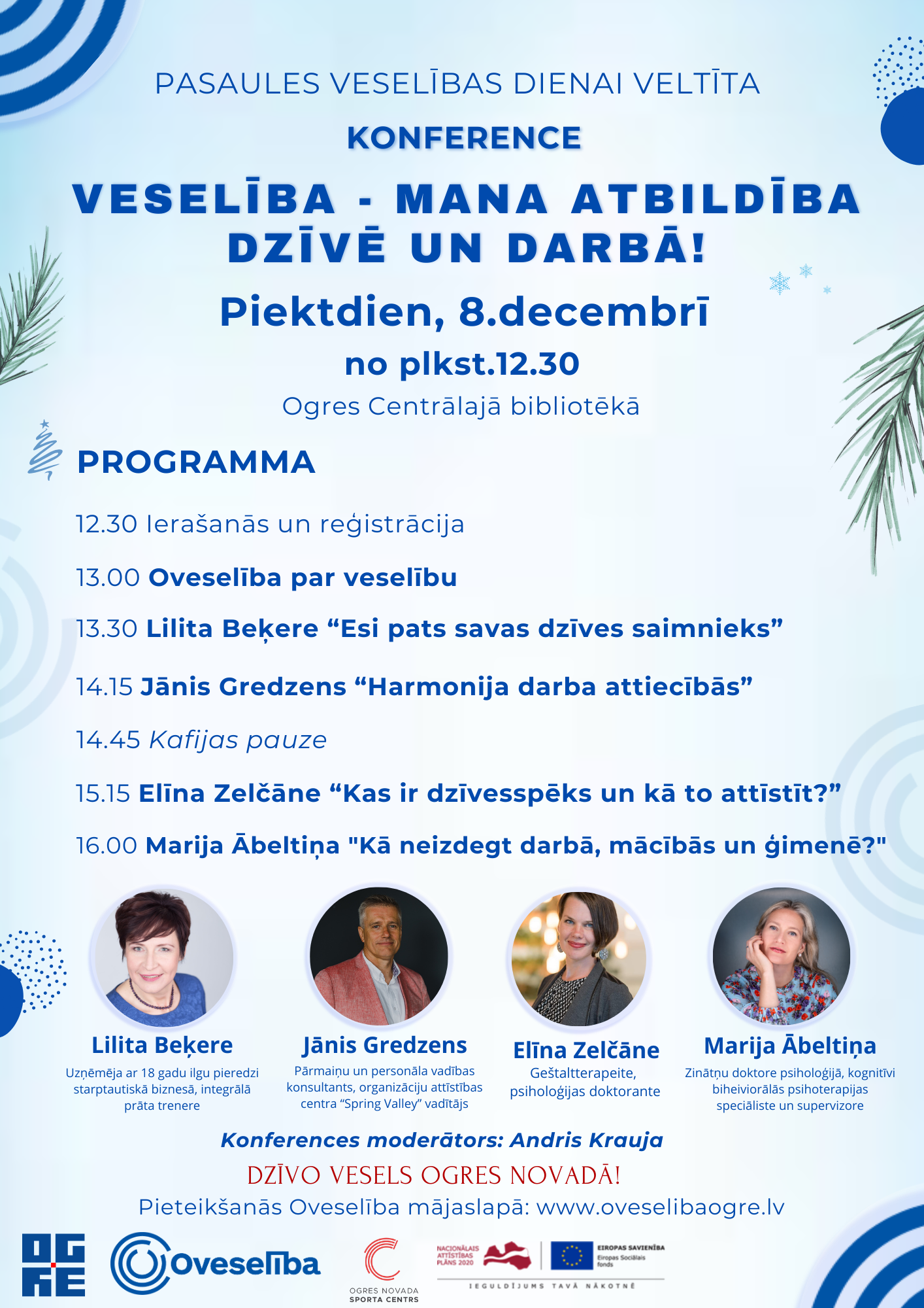Aicinām apmeklēt Oveselības ikgadēji organizēto Pasaules Veselības dienai veltītu konferenci “Veselība – mana atbildība dzīvē un darbā!”, kas norisināsies piektdien, 8. decembrī, no plkst.12.30 Ogres Centrālajā bibliotēkā!