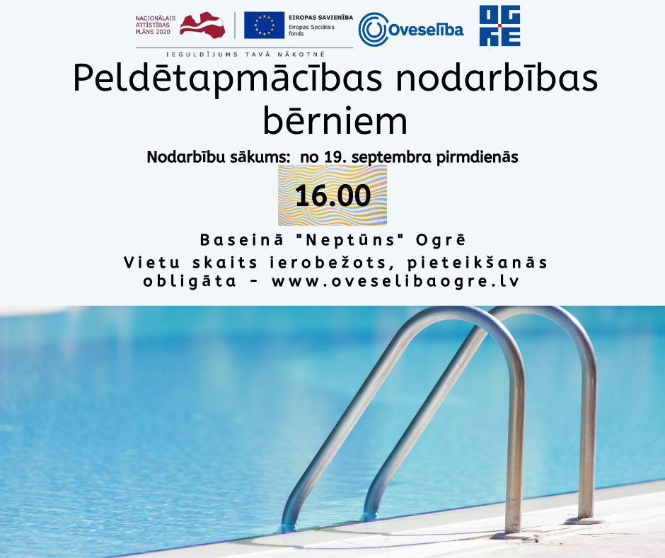 Oveselība aicina bērnus vecumā no 6-8 gadiem uz bezmaksas peldētapmācības nodarbībām Ogres baseinā “Neptūns” no 19. septembra pirmdienās plkst. 16.