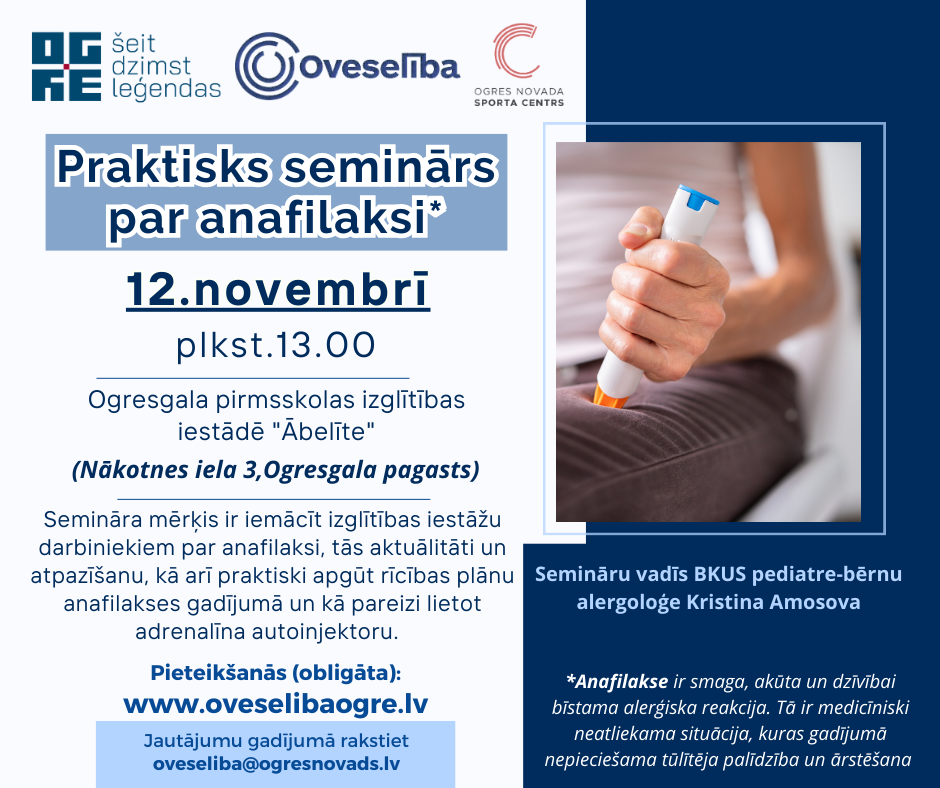 12.novembrī plkst.13.00 Oveselība aicina izglītības iestāžu darbiniekus piedalīties praktiskā seminārā par anafilaksi*, kas norisināsies PII “Ābelīte”, Nākotnes ielā 3, Ogresgalā, Ogresgala pagastā.