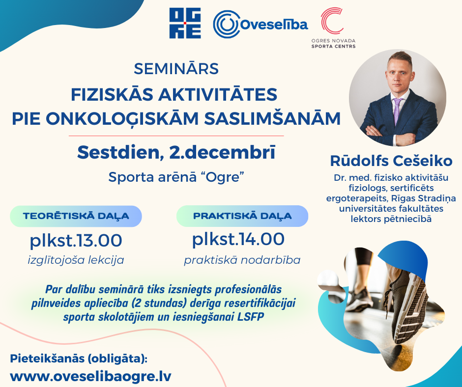 Acinām sporta speciālistus, fitnesa trenerus, skolotājus un veselības veicināšanas speciālistus uz pilnveides semināru par tēmu “Fiziskās aktivitātes pie onkoloģiskām saslimšanām”, kas norisināsies 2.decembrī no plkst.13.00 Sporta arēnā “Ogre”!