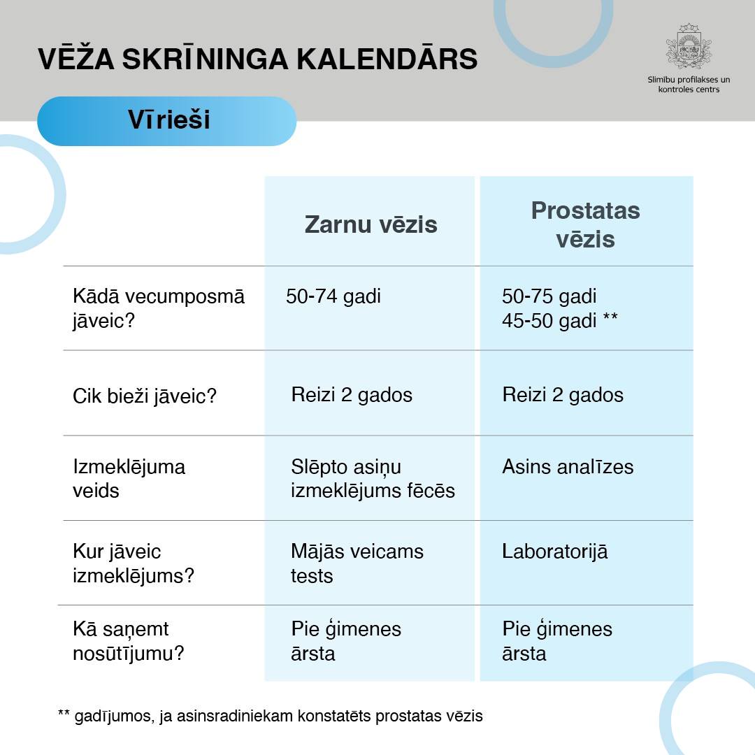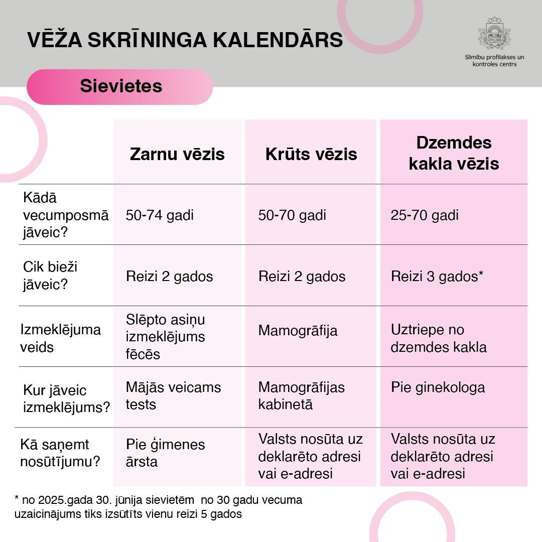 Aplūko skrīninga kalendāru un esi zinošs kādus valsts apmaksātus vēža skrīninga izmeklējumus ir iespējams veikt! ![]()