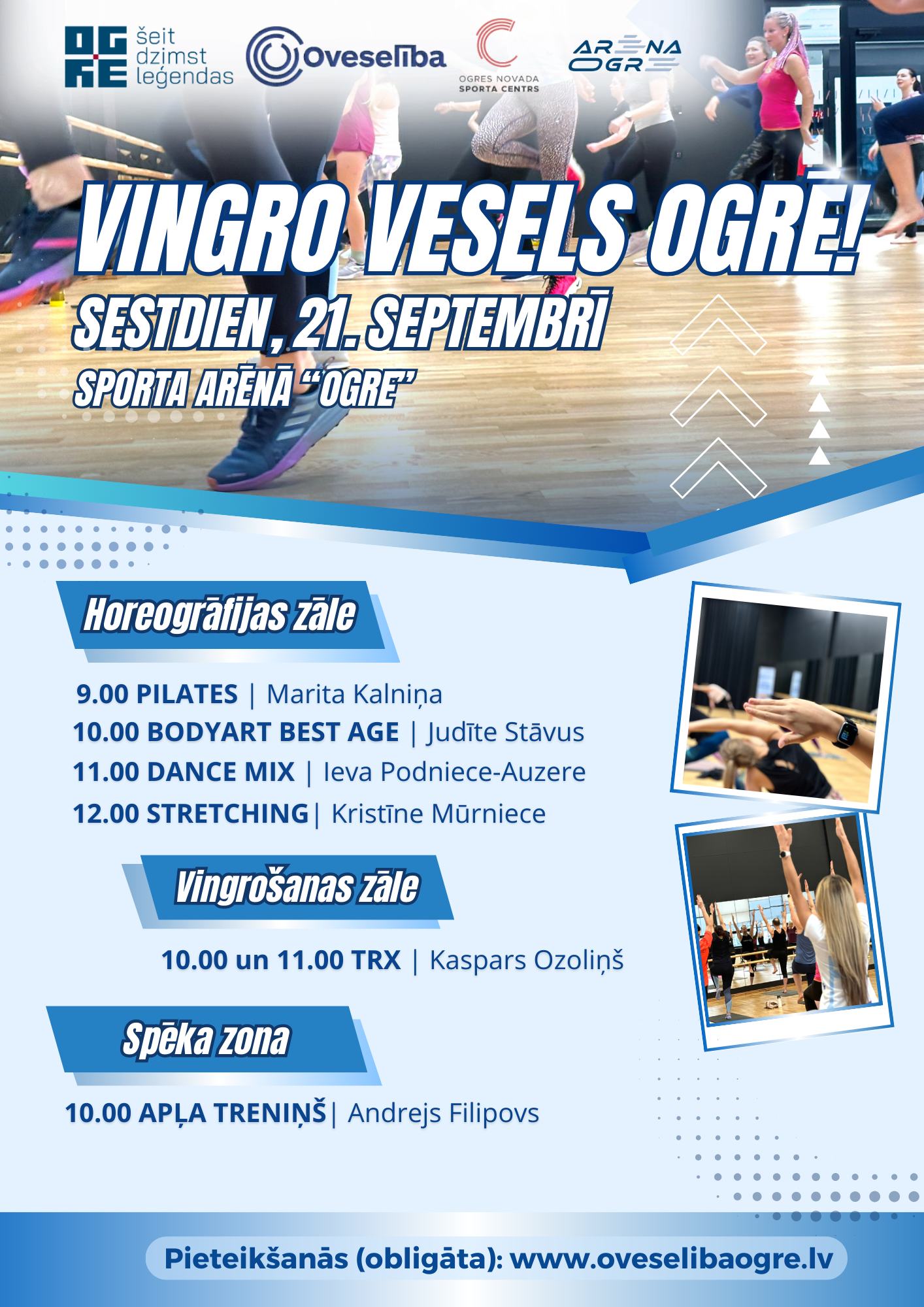 21.septembrī, sestdien, aicinām izmantot pēdējo iespēju un piedalīties “Vingro vesels Ogrē!”, kas norisināsies Sporta arēnā “Ogre” no plkst.9.00. Pasākuma programma, kā ierasts, ir veidota ļoti daudzveidīga, tāpēc tajā ko sev tīkamu atradīs ikviens interesents!