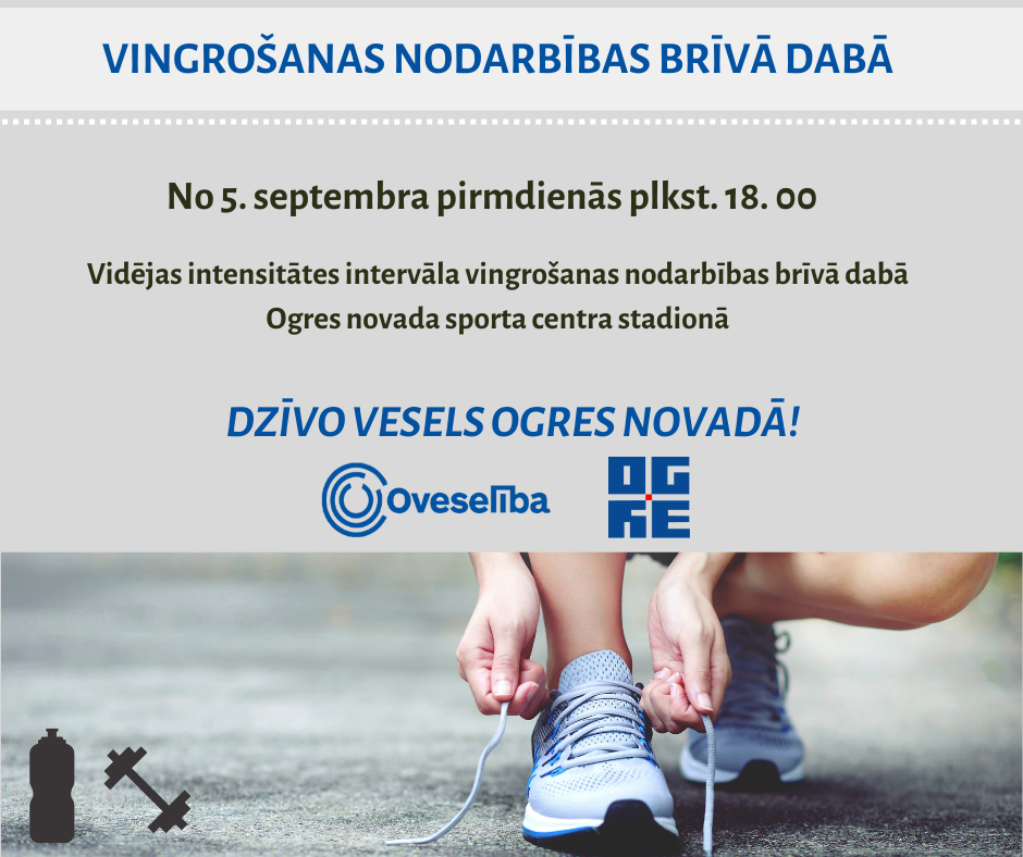 Sākot no 5. septembra pirmdienās plkst. 18.00, Oveselība aicina uz vidējas intensitātes intervāla vingrošanas nodarbībām brīvā dabā Ogres novada sporta centra stadionā. Nodarbības bez maksas.
